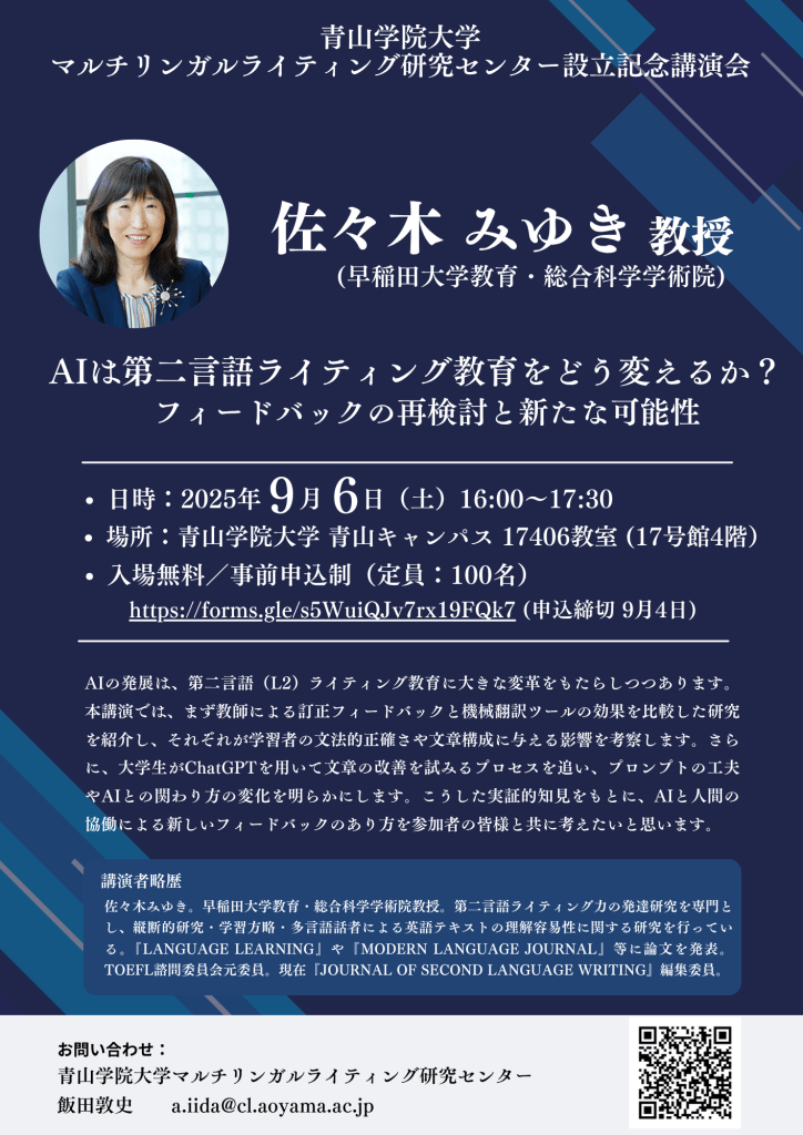 この度,AGUマルチリンガルライティング研究センターでは,佐々木みゆき先生(早稲田大学)をお招きし,センター設立記念講演会を開催いたします。