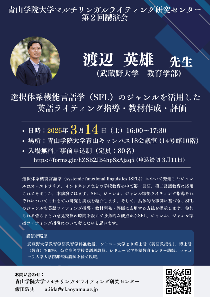 マルチリンガルライティング研究センターでは,第2回講演会を開催いたします。今回は,渡辺英雄先生(武蔵野大学)をお招きし,Systemic Functional Linguistics (SFL)を取り入れた英語ライティング指導について考えていきます。つきましては,こちらのリンク(https://forms.gle/hZSB2JB4hpSzAjaq5)より,事前申込の上,講演会にご参加いただきますようよろしくお願いいたします。ライティング研究に携わる先生方はもちろんのこと,現職の先生方,大学院生や学部生も参加可能です。
